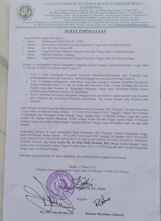 Surat pernyataan tersebut juga menegaskan bahwa Ketua STAI Al-HIkmah Tebingtinggi yang diangkat oleh pengurus Yayasan adalah tidak sah karena melanggar anggran rumah tangga Yapestia.