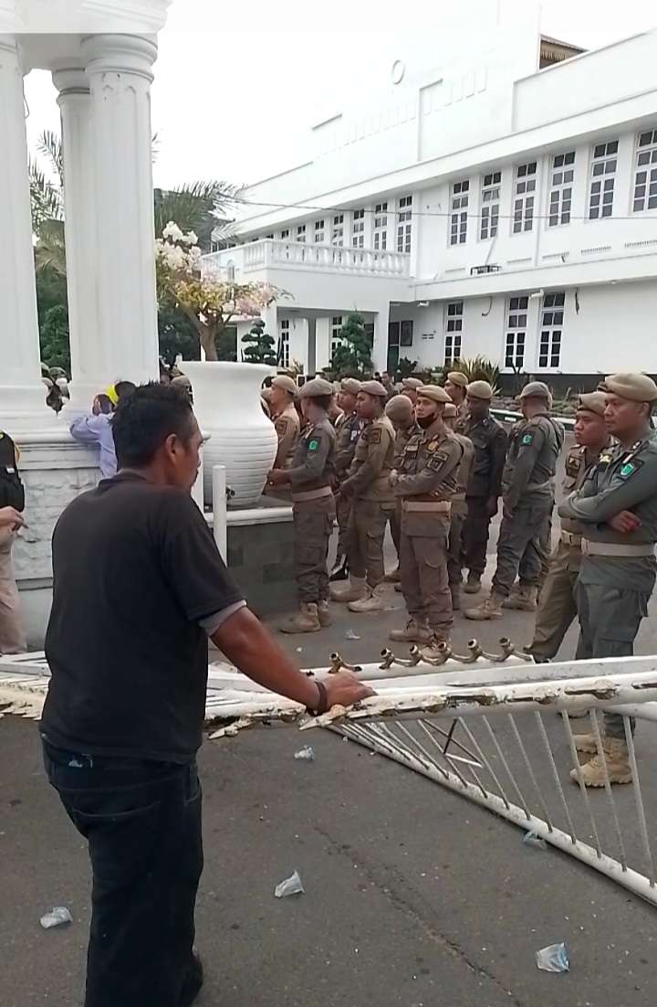 Massa merobohkan dua pintu gerbang utama kantor pemerintahan setelah terjadi aksi dorong-mendorong dengan petugas keamanan.