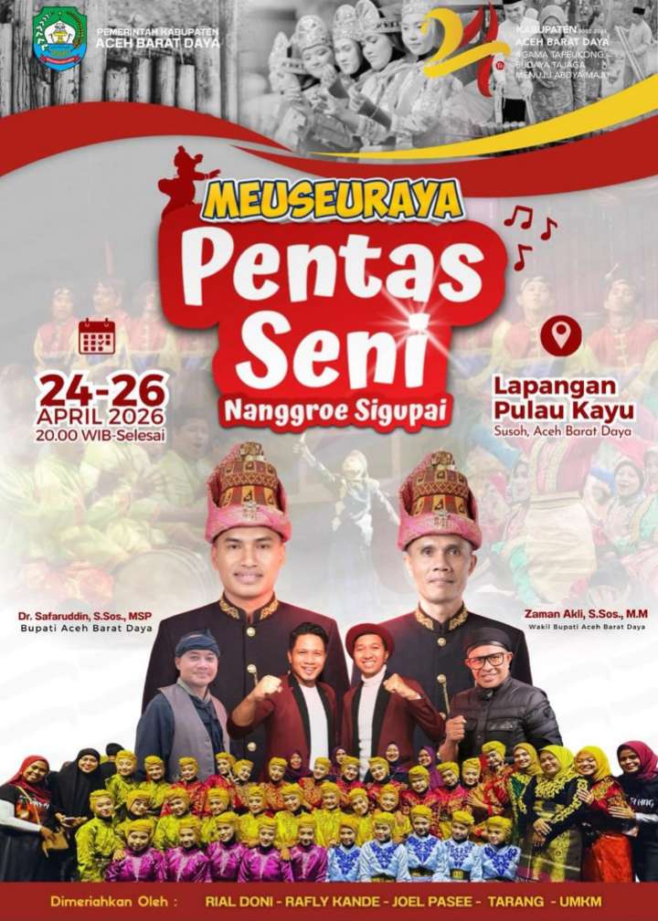 Meuseuraya Pentas Seni Nanggroe Sigupai tidak hanya menjadi ajang hiburan dalam rangka HUT ke-24 Kabupaten Aceh Barat Daya (Abdya), tetapi juga dimanfaatkan sebagai ruang pemberdayaan UMKM untuk menggerakkan ekonomi masyarakat. Kegiatan ini akan berlangsung pada 24–26 April 2026 di Lapangan Pulau Kayu, Susoh, mulai pukul 20.00 WIB hingga selesai. Kamis (23/4/2026).