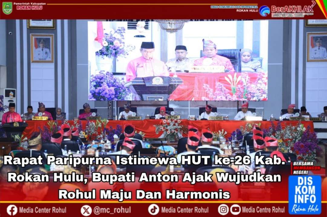 Rapat Paripurna Istimewa HUT ke-26 Kabupaten Rokan Hulu, Bupati Anton Ajak Wujudkan Rohul Maju dan Harmonis